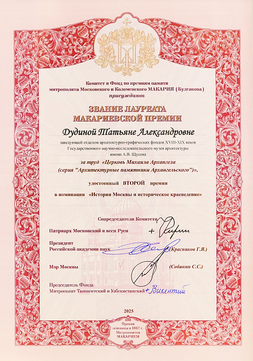Главный научный сотрудник, заведующая Научным отделом хранения архитектурно-графических фондов XVIII-XIX веков Татьяна Александровна Дудина стала лауреатом премии памяти митрополита Московского и Коломенского Макария по гуманитарным наукам 2025 года. Татьяне Александровне присуждена вторая премия в номинации «История Москвы и историческое краеведение» за книгу «Церковь Михаила Архангела» в серии «Архитектурные памятники Архангельского».