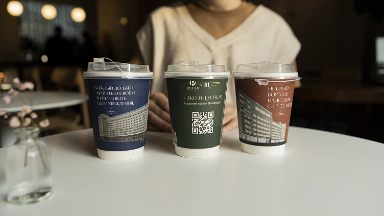Стиль стаканчиков для напитков навынос разработан графическим дизайнером Музея. Основные цвета – темно-зеленый, глубокий синий и бордовый – это те цвета, которые Щусев часто использовал в оформлении фасадов и интерьеров своих построек. К тому же, они очень осенние. Здания на стаканчиках – это главные московские постройки Щусева: Казанский вокзал, гостиница «Москва», здание Наркомзема. Подлинные графические листы с этими проектами можно увидеть на выставке «Алексей Щусев. 150». Цитаты мастера, всю жизнь остававшегося верным своему делу, вдохновят посетителей на новые свершения.