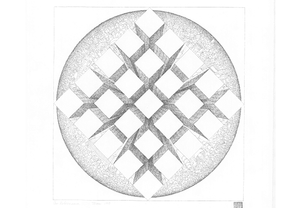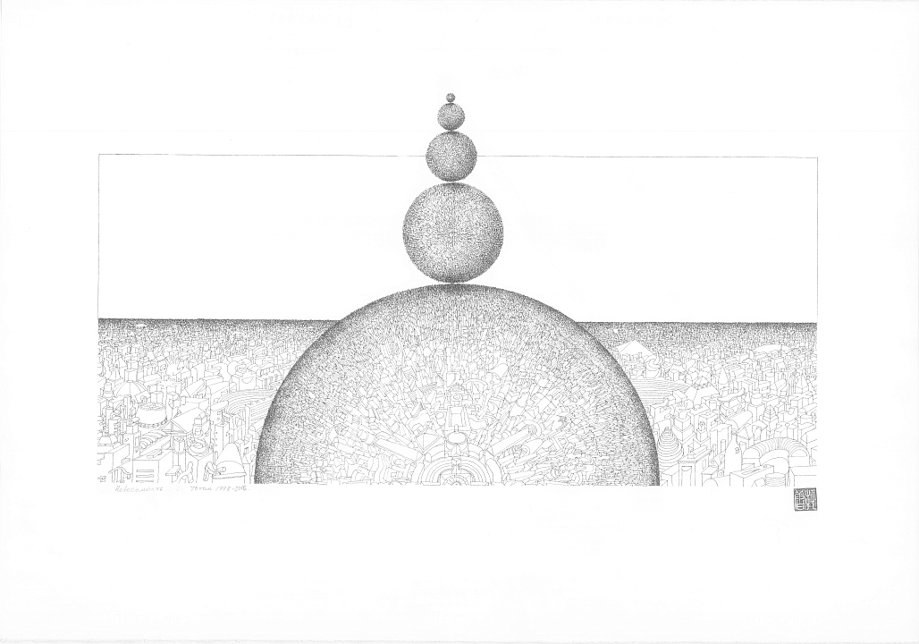 Графический трактат «Невесомость» (к этой серии относится 44 из 56 графических работ, представленных в экспозиции) повествует о метавселенной Тотана, где космические силы растягивают, скручивают, деформируют города, но не разрушают и не уничтожают материю. При этом, спокойная манера письма, переходящая в миниатюрную, передает ощущение безмятежности жителей этих городов.