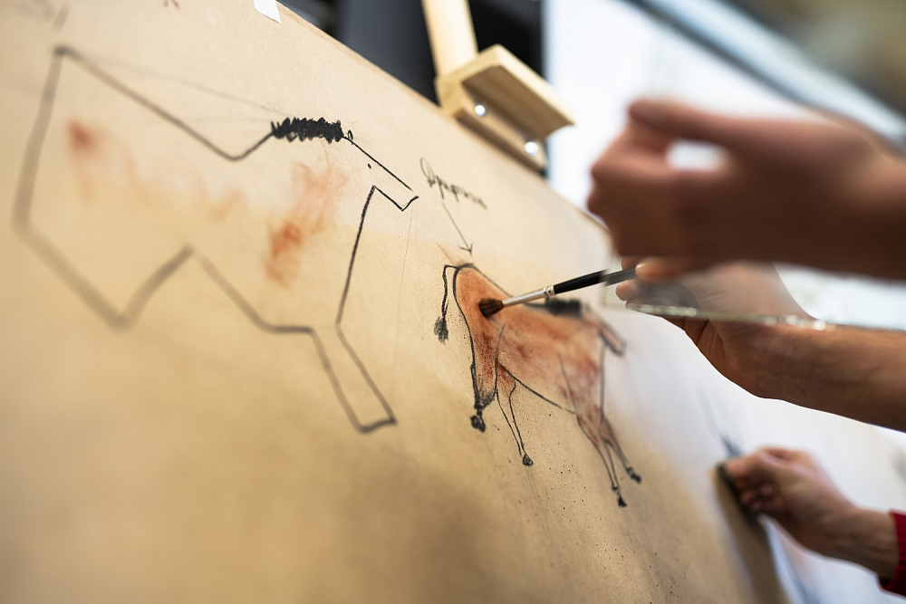 Ребята, которые в течение учебного года знакомились с работой художника-монументалиста, представляют на выставке написанные ими фрески. На занятиях участники студии исследовали древнейшую пещерную живопись и создавали работы, вдохновленные рисунками в пещерах Шове и Альтамира. А затем юные художники приступили к исследованию египетского живописного канона и написали копии известных египетских фресок.