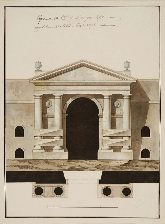 Архитектура усадебных построек, представлена на выставке несколькими разнообразными проектами – от монументального дома-дворца в подмосковном Воронове, изящных павильонов в Ляличах и Знаменском-Райке, до сугубо утилитарных, но по-львовски тщательно продуманных чертежах теплицы и дровяного сарая. Ярким примером городского строительства в раннем творчестве Львова является проект Невских ворот Петропавловской крепости в Петербурге, датированный 1780 годом. На выставке можно увидеть чертеж, представляющий строгую и выразительную архитектуру парадных ворот крепости со стороны Невы. Это сооружение и в наши дни играет значительную роль в береговой панораме центра Петербурга.