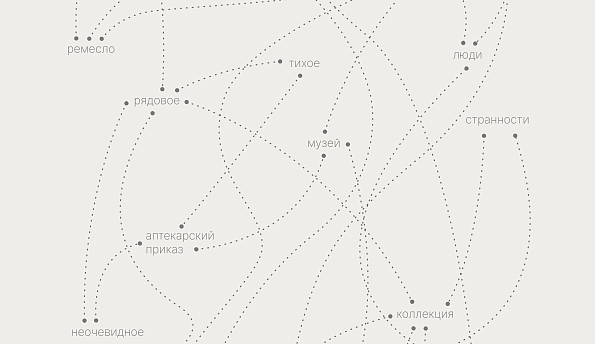 Координаты каждого экспоната в Аптекарском приказе связаны смысловыми пунктирами и объединены множеством многослойных тем, часть которых зафиксирована на карте при входе на выставку. Проделать собственную лабораторную работу и вывести дополнительные перекрестные значения может посетитель, читая пояснительные тексты участников.