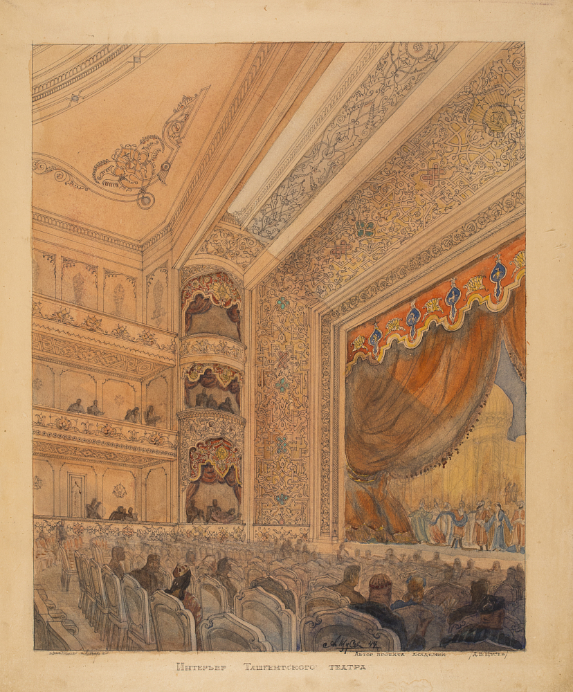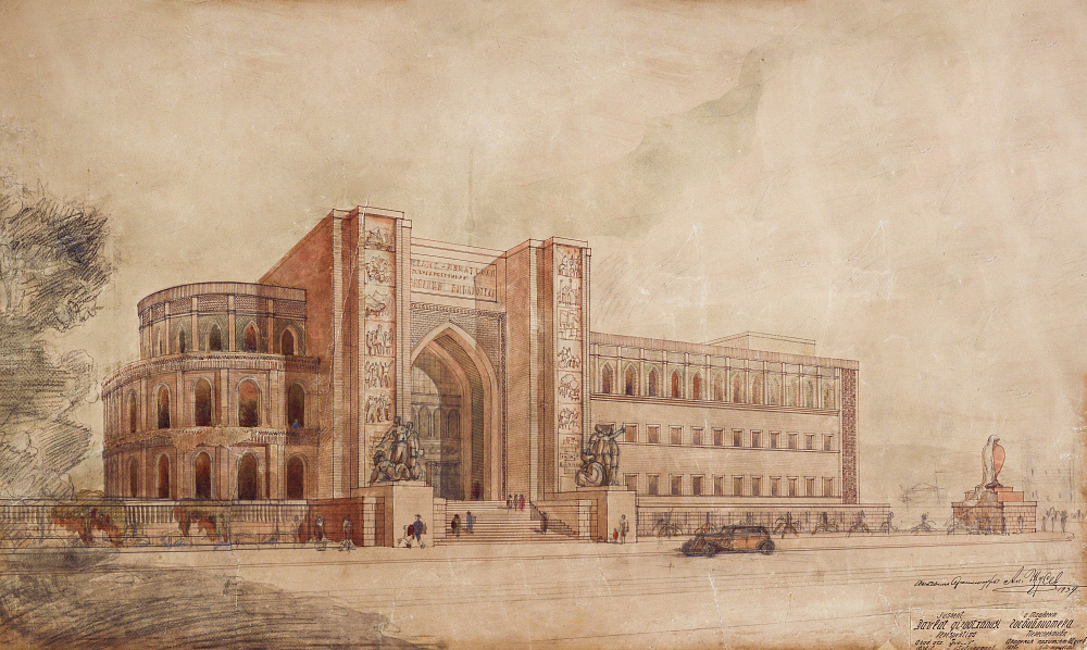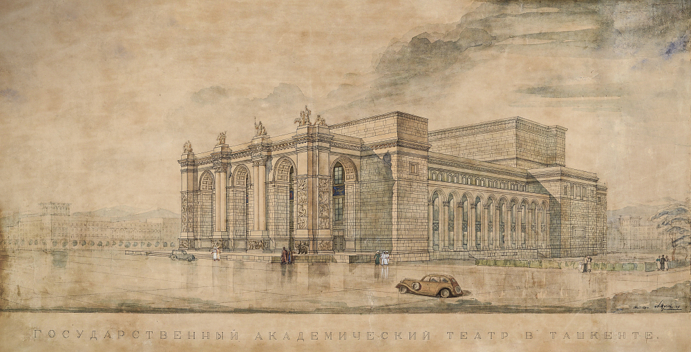 «Главным героем» второго раздела выставки является здание Театра оперы и балета имени Алишера Навои в Ташкенте – одно из самых крупных сооружений зодчего, за которое в 1948 году он был награжден Сталинской премией Первой степени. Алексей Щусев начал работать над проектом еще в 1934 году, и за годы строительства облик будущего здания претерпел множество изменений, прежде чем открыть свои двери для зрителей 7 ноября 1947 года. История проектирования и строительства театра раскрывается в графических листах с вариантами фасадов, оформления интерьеров и даже фурнитуры грандиозного здания театра. Особое внимание уделено узбекским народным мастерам, которые внесли огромный вклад в художественное оформление здания, выполнив тончайшую резьбу по ганчу и дереву для интерьеров. На выставке можно будет увидеть архивные фотографии и кинохронику с мастерами в процессе работы, фотографии украшенных ими залов.