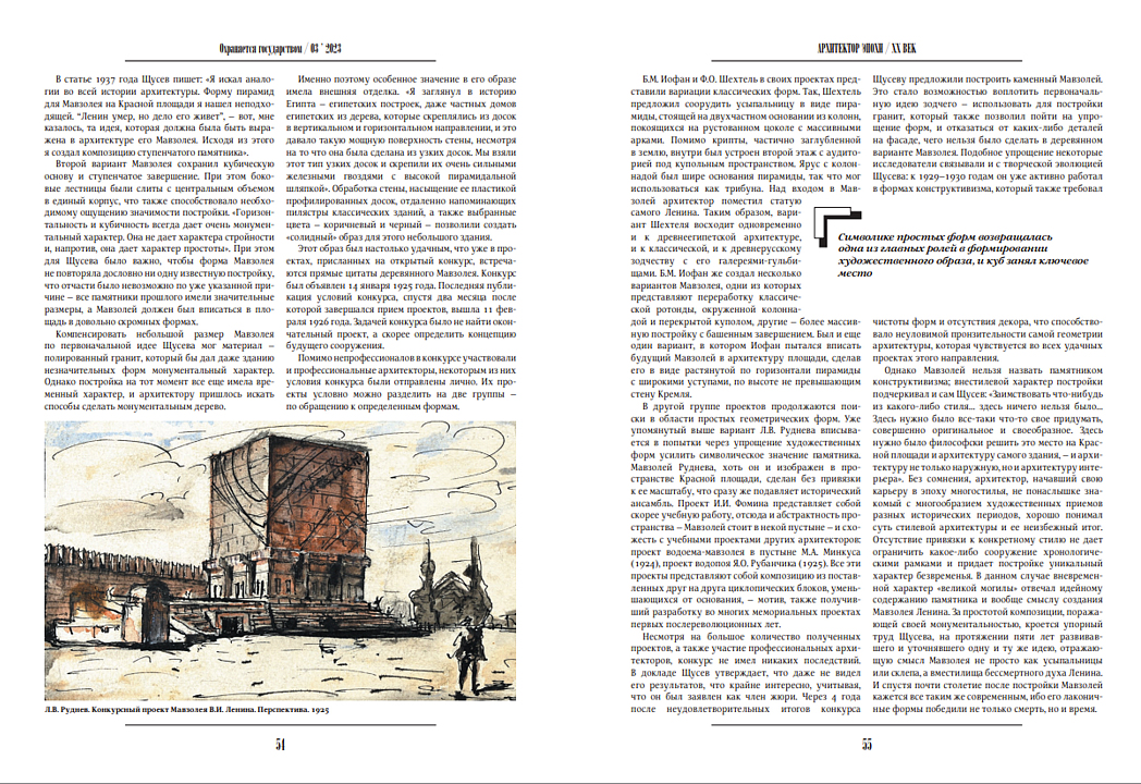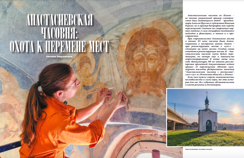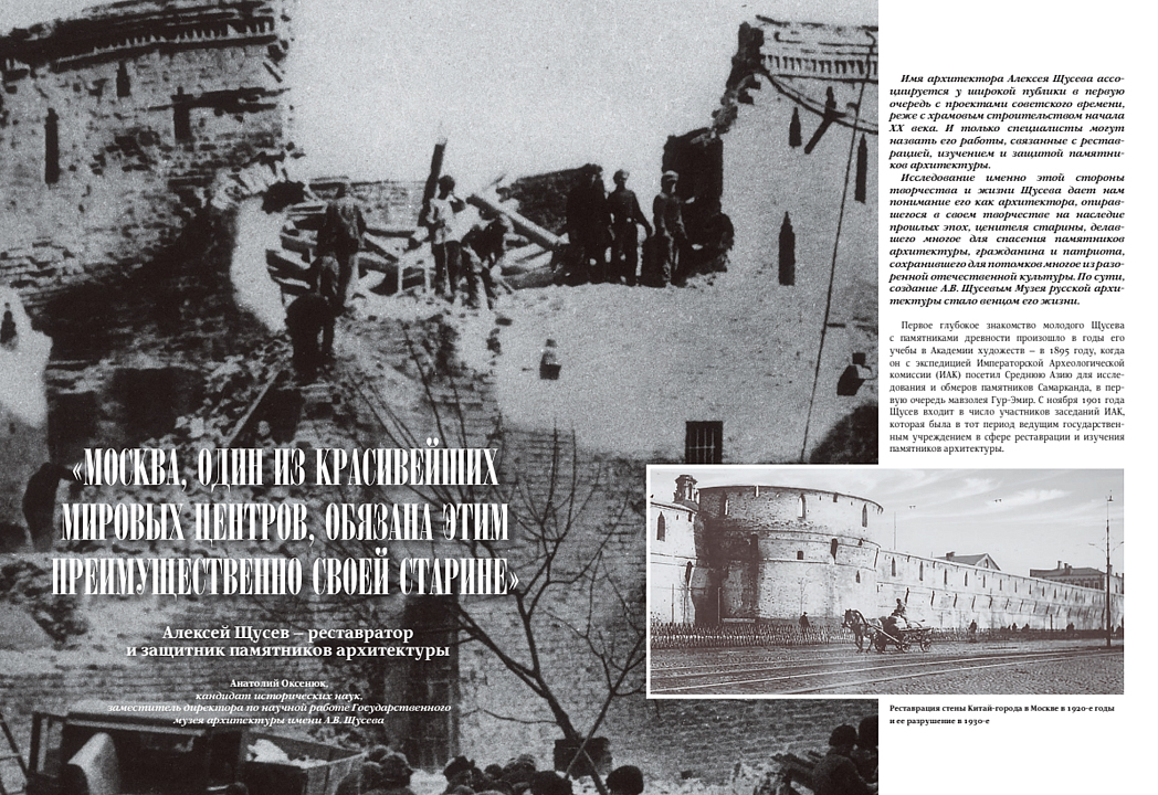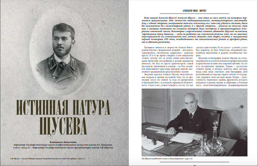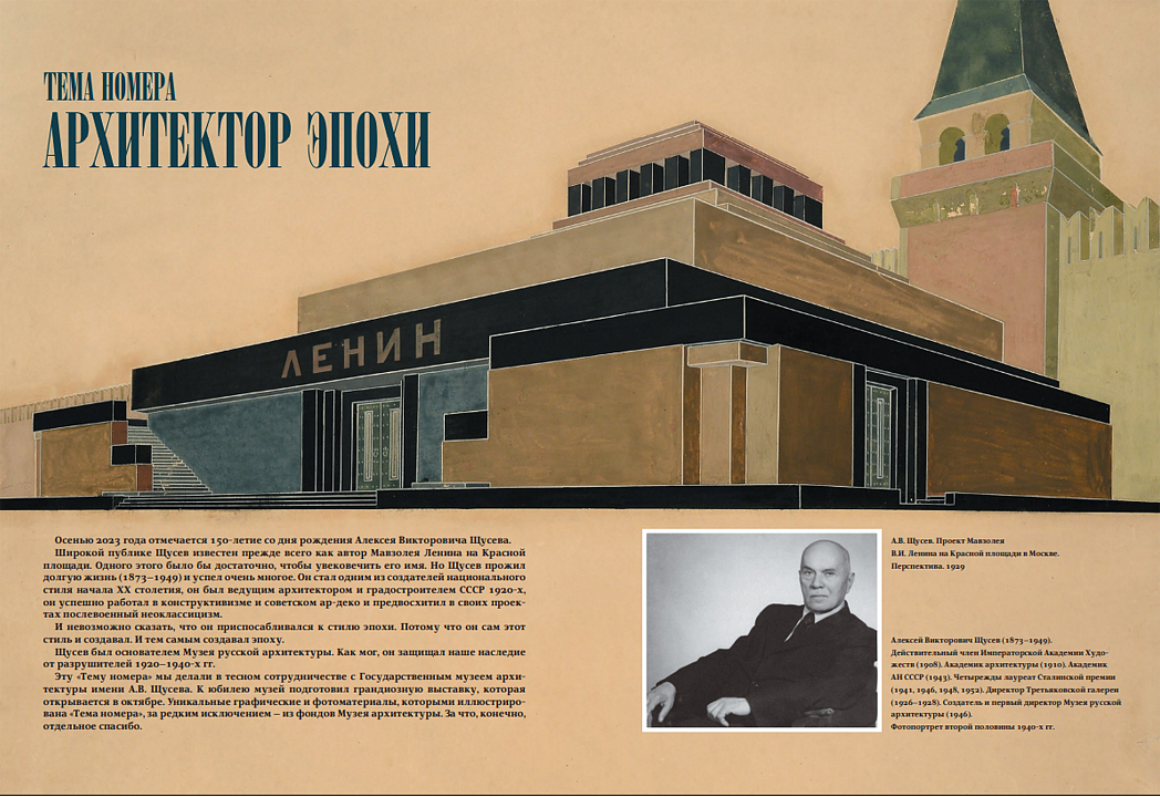 Большинство материалов выпуска подготовлены сотрудниками Музея архитектуры. Творческие идеи и замыслы, знаменитые и малоизвестные постройки зодчего, заслуги Щусева как реставратора и защитника памятников старины – под одной обложкой журнала. Отдельный материал посвящен планируемому переносу часовни св. Анастасии Римлянки во Пскове, спроектированной Щусевым.