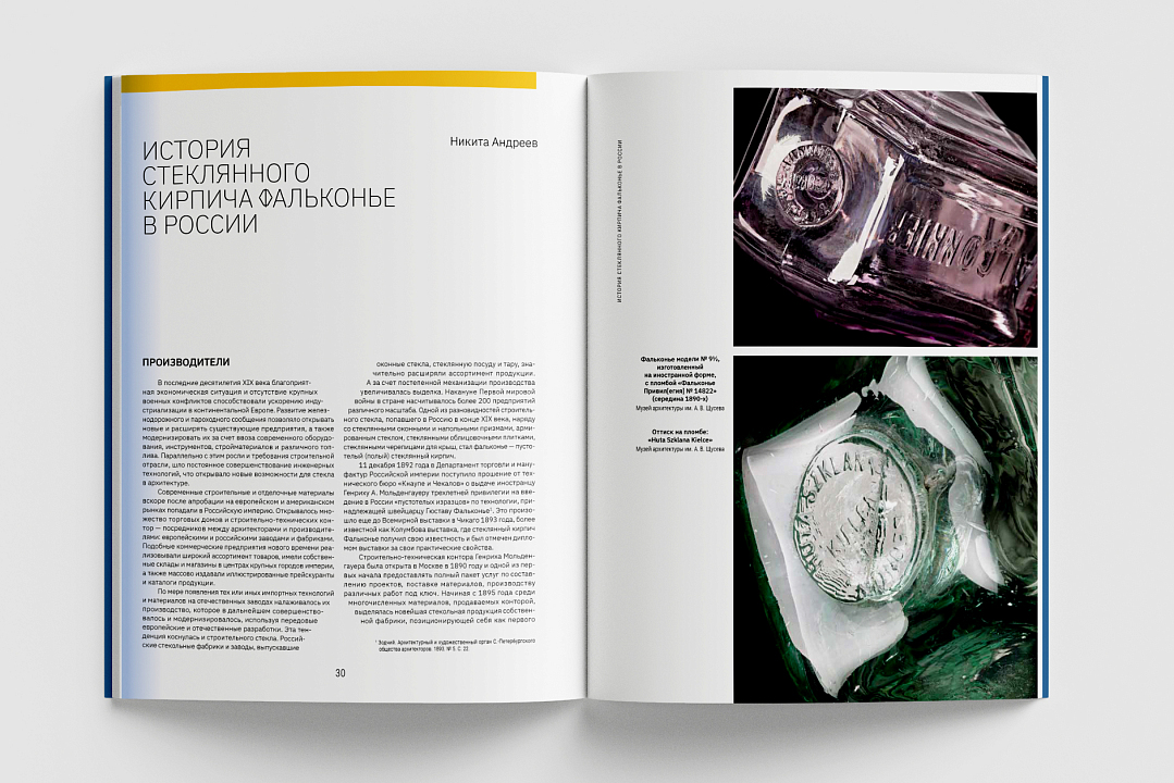 Постепенную замену изделия эпохи модерна на стеклоблок, активно применявшийся в строительстве в советское время, описывает в своей статье коллекционер Георгий Коротков. Об особенностях эстетики и практическом потенциале выдувных кирпичей и стеклоблоков для современных архитекторов пишет Елена Антонова, основатель и руководитель BURO ALL DESIGN. Погружает в историю декоративного архитектурного стекла рубежа XIX-XX веков искусствовед, автор научных статей и монографий о витражном искусстве Татьяна Княжицкая.