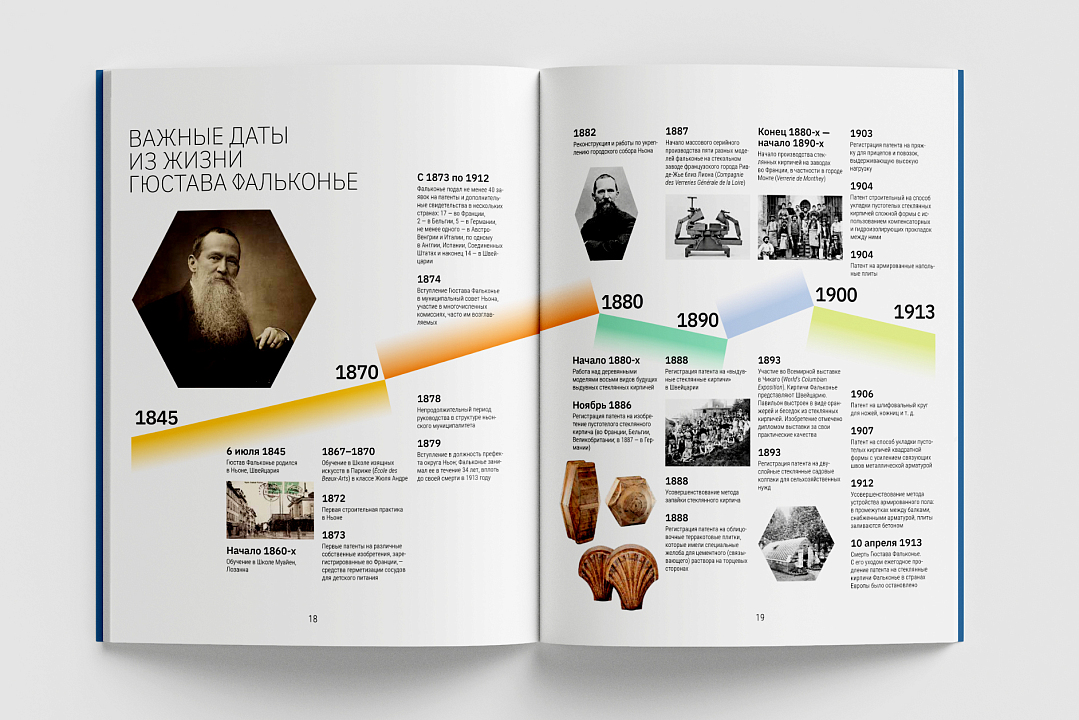 В книгу включены хроника распространения стеклянных кирпичей в Европе и лента дат важных событий в жизни Гюстава Фальконье, приведены изображения наиболее популярных моделей кирпича. На страницах издания можно увидеть фотосъемку современного производства изделий, уцелевших кладок из фальконье в знаковых памятниках архитектуры в России и за рубежом, кадры с выставки «Фальконье. Архитектура света».