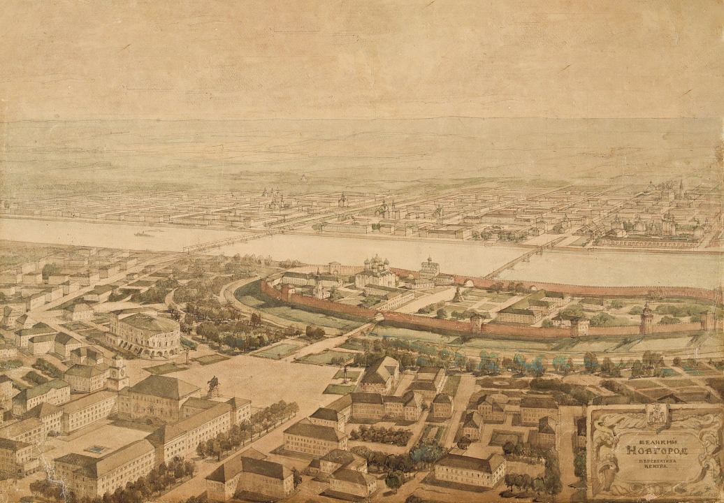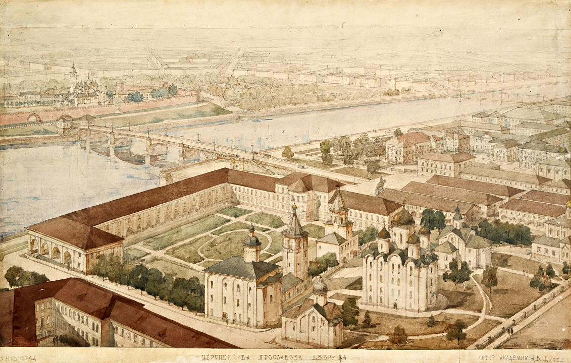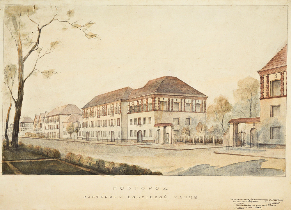 Великий Новгород, настоящая сокровищница русской старины, сильно пострадал в годы Великой Отечественной войны. Город больше двух лет находился на линии фронта, а к январю 1944 года представлял собой руины, на фоне которых белели четверики церквей. Новгород вошел в число 15 советских городов, к восстановлению которых приступили в первую очередь. За работы здесь отвечал коллектив под руководством Алексея Викторовича Щусева. Ему удалось создать современный городской ансамбль, узловыми точками которого стали древние архитектурные памятники. Команда Щусева занималась как реставрацией разрушенных храмов, так и реконструкцией города в целом.