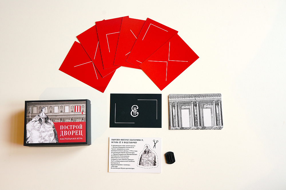 - Настольная игра «Построй дворец»: игра схожа интерактивностью с Дженгой, в которой игроки по очереди складывают карточки-стены по пунктирным линиям на них, чтобы получилась «башня». Таким образом, в каждом ходу возводится новый «этаж», на который ставится фигурка Екатерины II, завершая тем самым ход игрока.